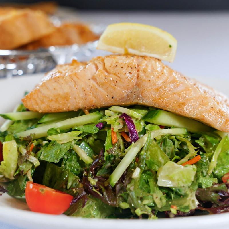 Oven roasted salmon fillet, fresh greens, romaine, cucumber, tomatoes, cranberries, red onion, house dressing